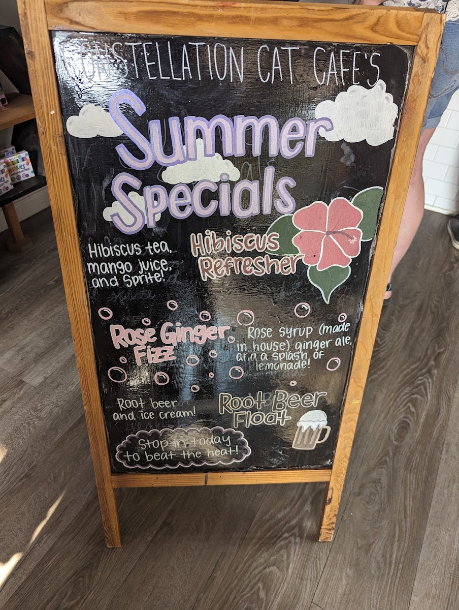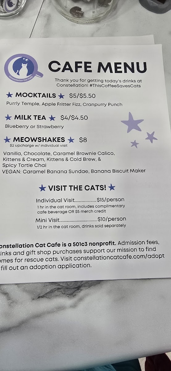 Welcome to Constellation Cat Cafe! Located at 3320 E Lake Lansing Rd, East Lansing, MI, this charming space not only offers a cozy atmosphere but also serves up a delightful menu of drinks that complement the experience of interacting with adorable adoptable cats. Customers rave about the creative beverage flavors that exceed those of major brands, making each sip a treat. Visitors can expect to find an array of sweet drinks, perfect for enjoying while spending time in the tranquil cat room.